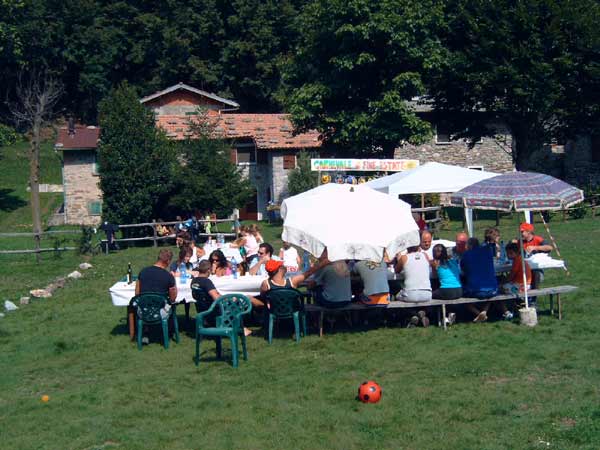 Carnevale di fine estate? Non ci credo, i colori di quel giorno erano di inizio estate, per cui la conseguenza del ritrovarci dopo la Messa Granda, aveva permesso alle donne di preparare un succulento quanto avanzato aperitivo che, a parte chi si guardò negli occhi tutto il dì, in breve aveva dotato i convenuti di una brillante mezzaluna all'insù le labbra di ognuno. D'obbligo la verifica della stabilità dei tavoli con possibilità di scelta tra sole o ombra, la conseguenza fu l'antipasto dai mille gusti, poi una caparbia e sfacciata fettona di polenta rivestita da un magnifico, profumato, splendido, gustoso spezzatino, annaffiato ( però senza annaffiatoio) da tanti bei calicetti di barbera, bonarda, cabernet, merlot. Per i palati più fini il bianco tocai,vermentino,pinot e chi si ricorda. Le bottiglie non furono comunque contate per evitare panico e gesti di disperazione delle donne che imprecavano contro un colesterolo che avanzava implacabile. Per fortuna una pausa; addolcita da un improvvisato concerto per strumenti a fiato, aveva ricomposto le fila delle chiappe sulle panche, inducendoci a prender visione sul da farsi circa la prossima sfilata. La scaia de grana, el tuchet de furmai, dolce e caffè si protrassero per tutto il pomeriggio; chi dormiva, chi, giocava, chi parlava, chi l'ghè le cuntava su ai tusann, chi raccontava, chi tentava e ritentava, così sino a sera, quindi, a chi rimase, un brodino per terminare un giorno trascorso con una compagnia indimenticabile. Agi 2006. |